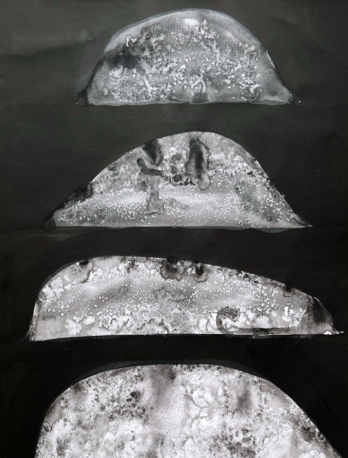 And then the images themselves that are grainy interiors of flesh. I painted them with salt so the pigment would bloom and fracture, explode across the page. They look like small universes. Fear is there. Violence is there. But also a strange beauty inside what we dread.